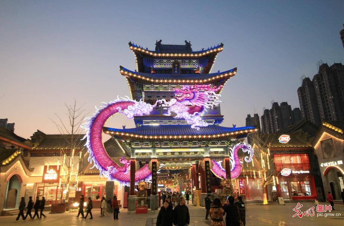 2025年12月27日夜,游客在甘肃省兰州市七里河区兰州老街赏灯游玩。(许岗摄/光明图片)